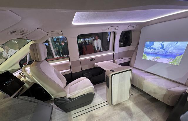 新车采用的是2+3座椅布局,整个车内地板是平整的,主驾座椅能够180度旋转,副驾座椅可以向前掀起。中央扶手箱底部带有前后滑轨,能够在前后排之间调整,还带有折叠式的桌板。另外新车的一大亮点是后部带有伸缩式的大幕布,形成了家庭影院的效果。
