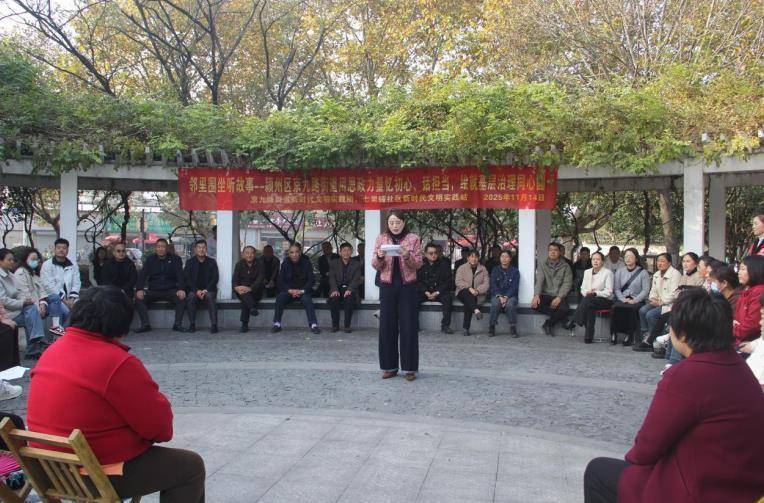 这是京九路街道“邻里围坐听故事”思政宣讲活动的生动场景。为让思政教育走出会议室、走进群众中,京九路街道创新宣讲形式,挖掘身边的榜样典型,邀请退役老兵、孝老爱亲模范、见义勇为勇士、基层工作者、志愿者等走上“百姓讲台”,用真实经历、朴实语言讲述初心故事、传递担当力量,让思政宣讲既有温度又有力量。