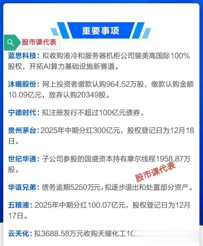 据悉,多家上市公司发布重要动态。蓝思科技拟收购裴美高国际,布局AI算力基础设施;贵州茅台、五粮液分别计划中期分红300亿元、100.07亿元。